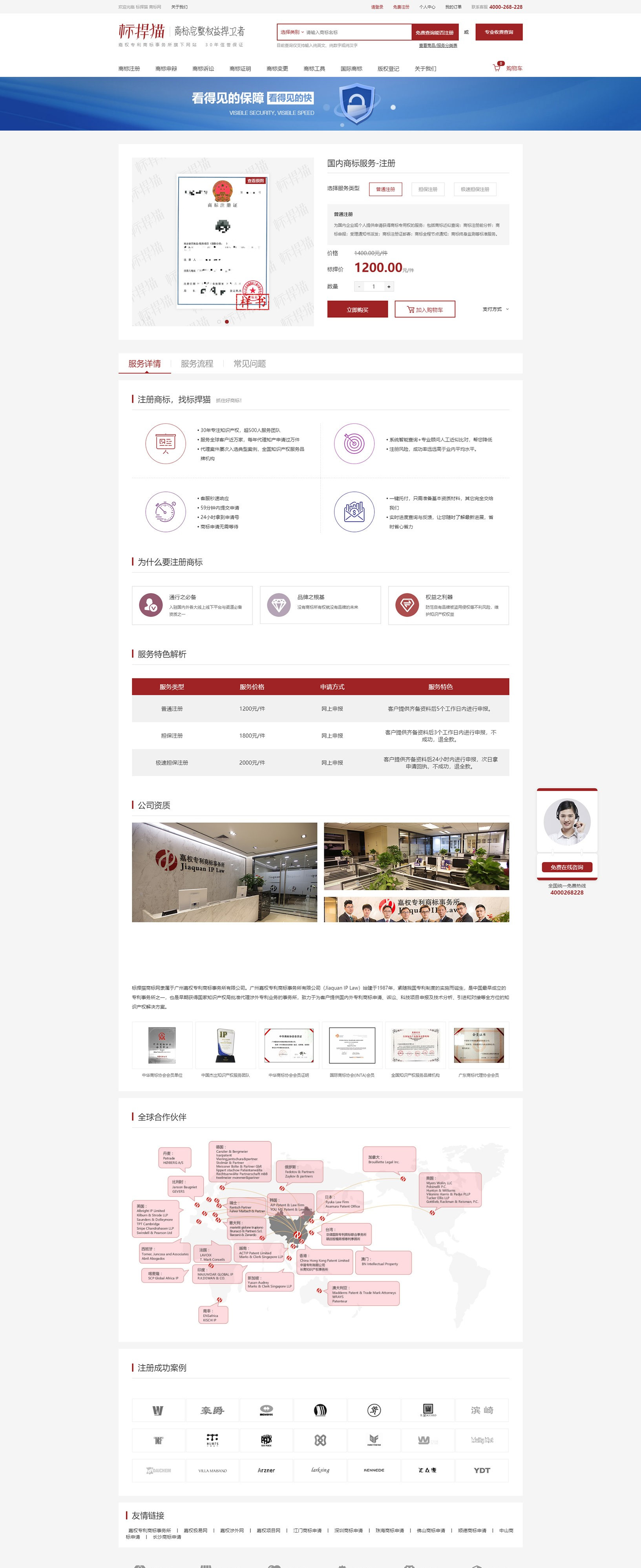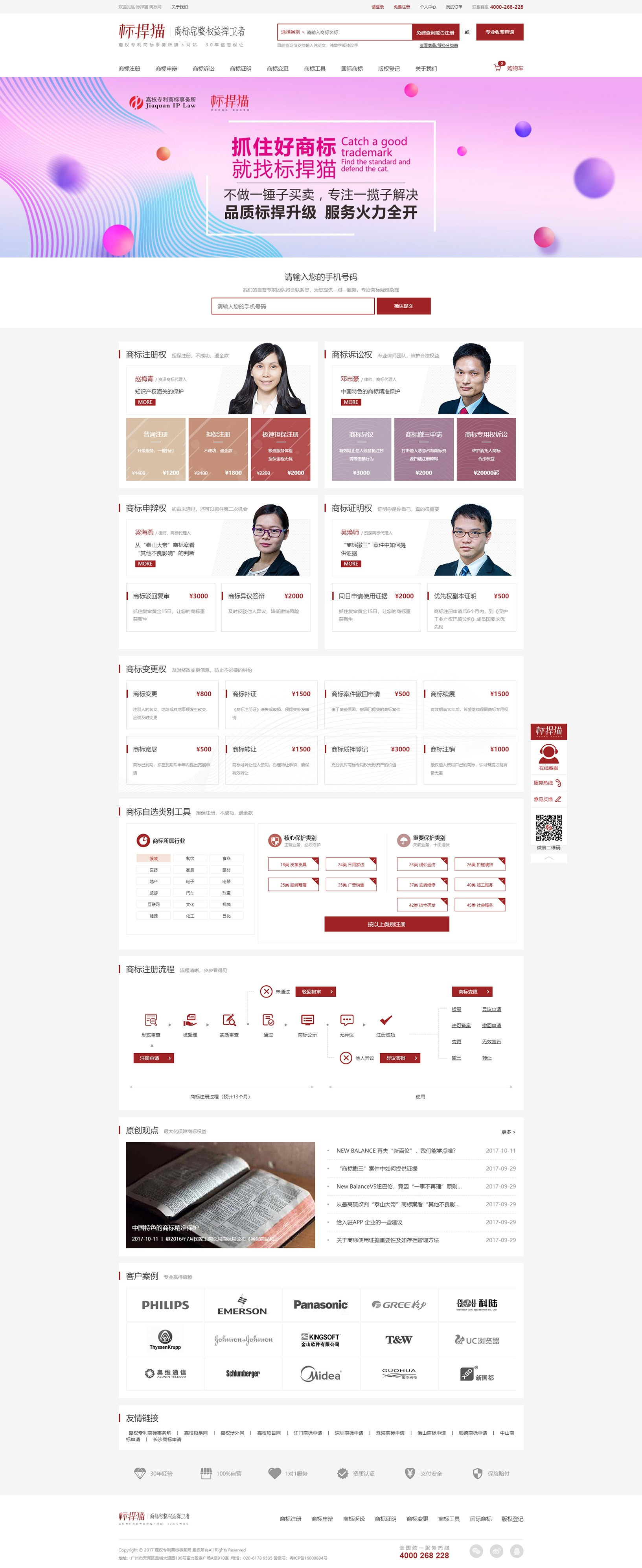 標(biāo)捍貓商標(biāo)網(wǎng)是廣州嘉權(quán)專利商標(biāo)事務(wù)所有限公司旗下的知識產(chǎn)權(quán)法律服務(wù)線上平臺之一,憑借嘉權(quán)30多年積累的線下服務(wù)實(shí)力,可為客戶實(shí)現(xiàn)自助查詢、免費(fèi)檢索報(bào)告、一鍵下單、便捷支付、售后跟蹤等知產(chǎn)全鏈服務(wù)。標(biāo)捍貓積極響應(yīng)國家知識產(chǎn)權(quán)戰(zhàn)略,深入探索互聯(lián)網(wǎng)+知識產(chǎn)權(quán)模式,致力于打造全新的知識產(chǎn)權(quán)O2O服務(wù)模式,并運(yùn)用大數(shù)據(jù)、云平臺,將知識產(chǎn)權(quán)代理服務(wù)、咨詢服務(wù)、成果轉(zhuǎn)化、引進(jìn)輸出等產(chǎn)業(yè)生態(tài)連接起來,提升行業(yè)服務(wù)效率與質(zhì)量,構(gòu)建知識產(chǎn)權(quán)產(chǎn)業(yè)鏈新格局。